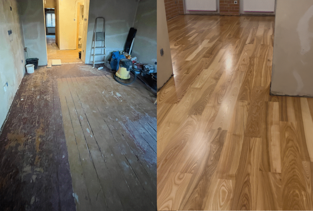 Na zakończenie podłoga została zabezpieczona wysokiej jakości lakierem, który podkreślił naturalny wygląd drewna oraz zwiększył jego odporność na intensywne użytkowanie. Dzięki przeprowadzonym pracom podłoga odzyskała estetykę i trwałość na długie lata.